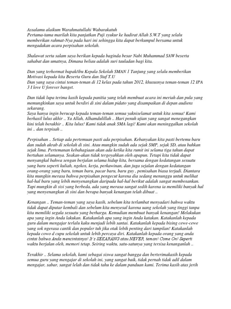 Pada kesempatan ini izinkanlah saya selaku wakil dari teman teman kelas 9 menyampaikan sepatah dua patah kata dalam rangka perpisahan dan kenaikan kelas ini.